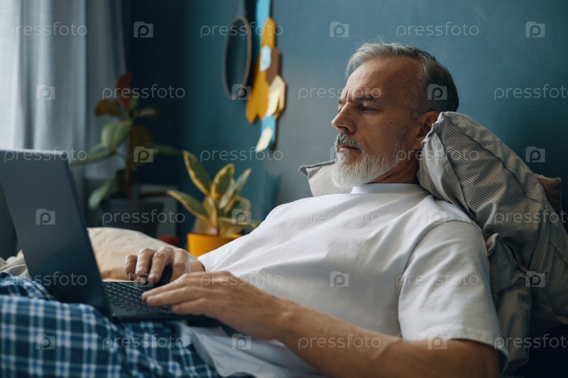 Пожилой мужчина лежит в постели, используя ноутбук для работы