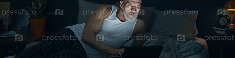 Портрет мужчины средних лет, использующего ноутбук в тускло освещенной комнате