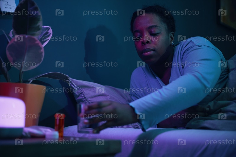 Достижение стекла на ночном столе, сидя в постели