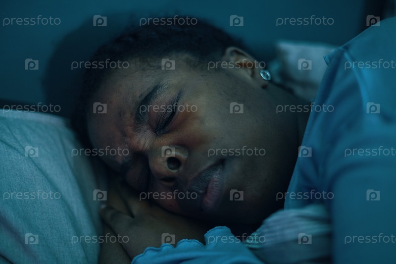 Спящий чернокожий человек, лежащий на подушке ночью