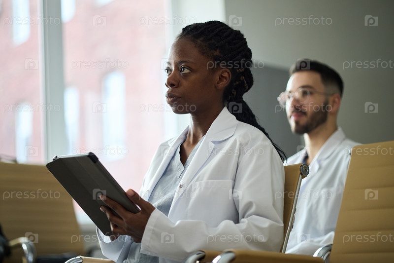 Американская женщина-врач, держащая планшет и обсуждающая случай с афроамериканцем