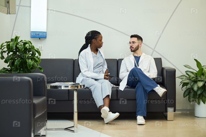 Медицинские специалисты обсуждают работу на диване в клинике
