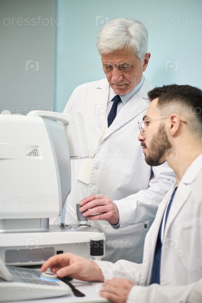 Пожилой врач контролирует молодого коллегу, использующего медицинское устройство