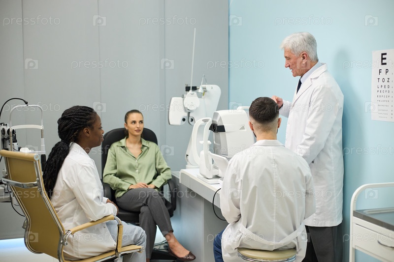 Команда, проводящая осмотр глаз в современной клинике