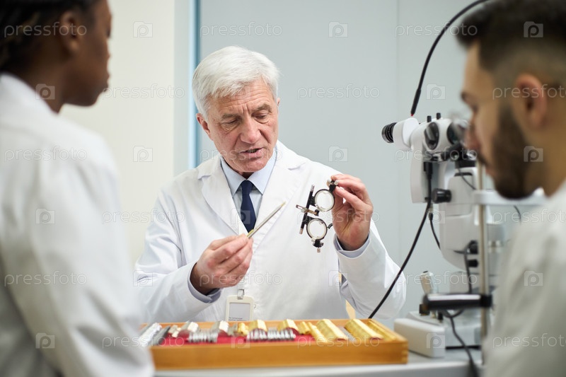 Мужской старший оптометрист демонстрирует инструмент тестирования зрения