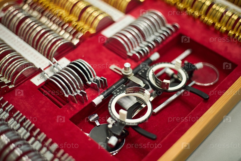 Displaying Various Ophthalmology Testing Lenses in Red Case Показывая различные офтальмологические тесты линз в красном случае