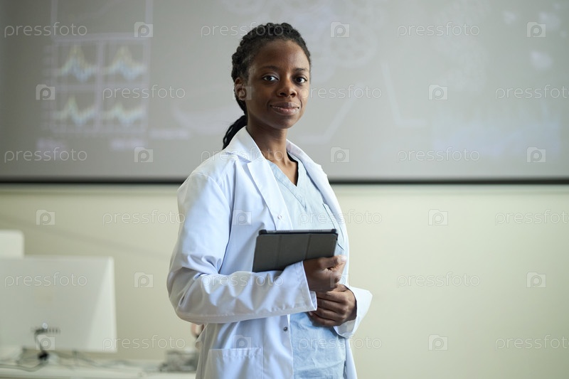 Портрет афроамериканской женщины-врача, держащей планшет