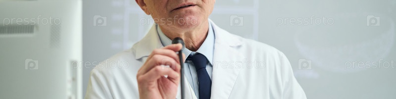 Портрет пожилого мужского врача, держащего микрофон