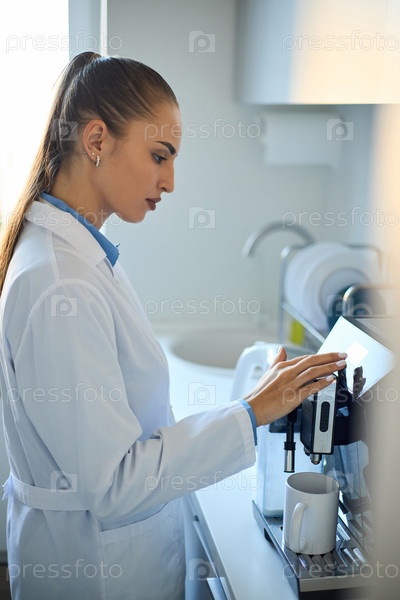 Женщина, готовящая кофе с помощью современной кофемашины