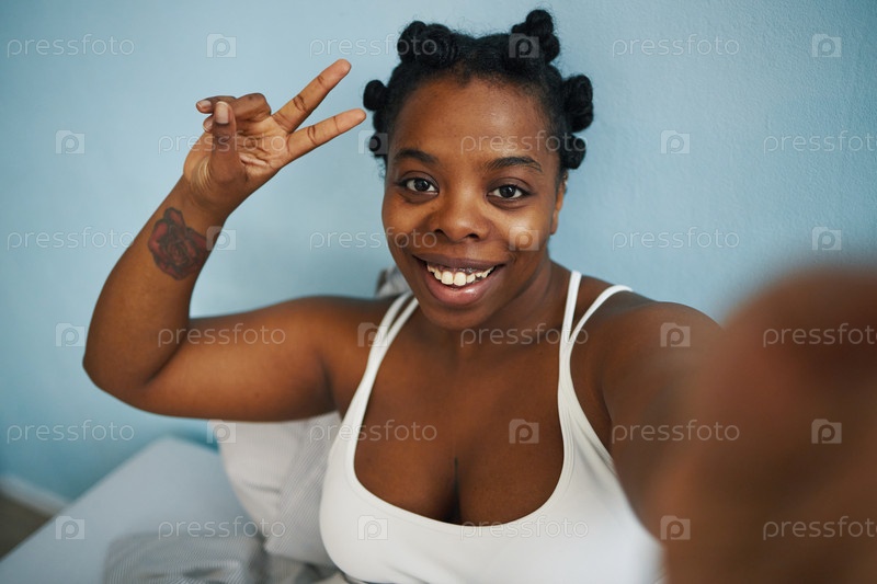 Улыбающаяся афроамериканская женщина делает селфи дома