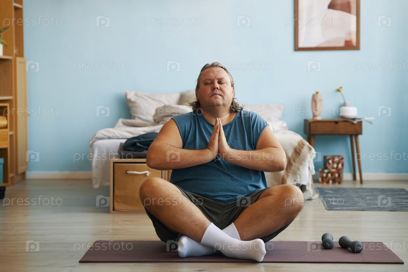 Медитирующий мужчина сидит скрещенными ногами на йога-матке