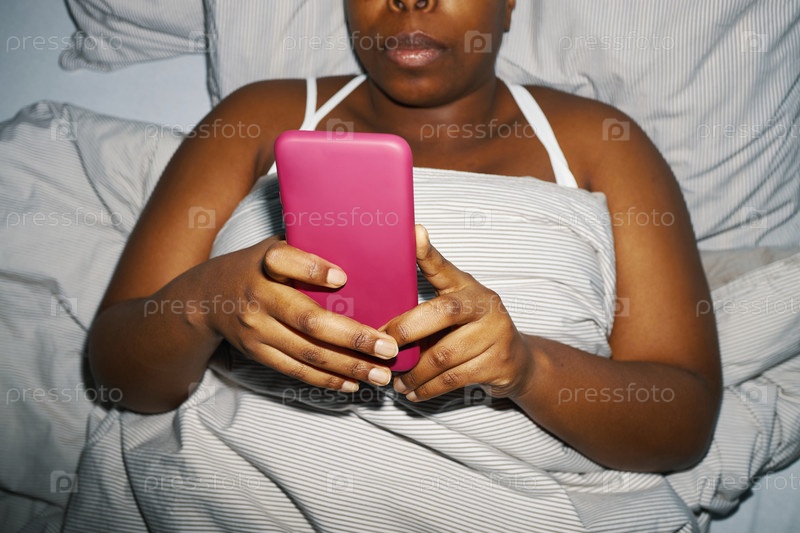 Афроамериканская женщина использует смартфон, лежа на кровати