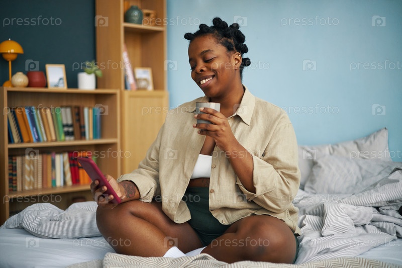 Афроамериканская женщина использует смартфон и улыбается
