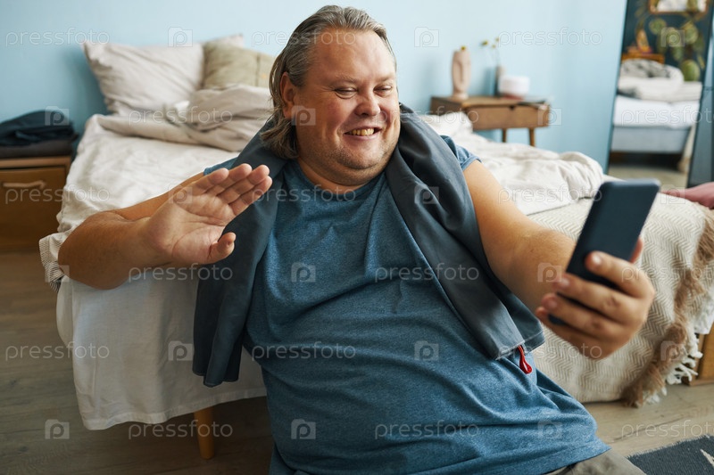 Улыбающийся мужчина средних лет машет экрану смартфона
