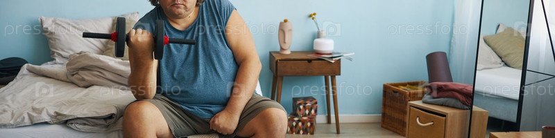 Портрет мужчины, поднимающего гантели в спальне