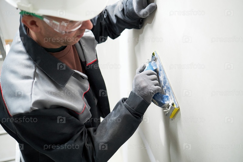 Мужчина со шпатулой работает на строительной площадке
