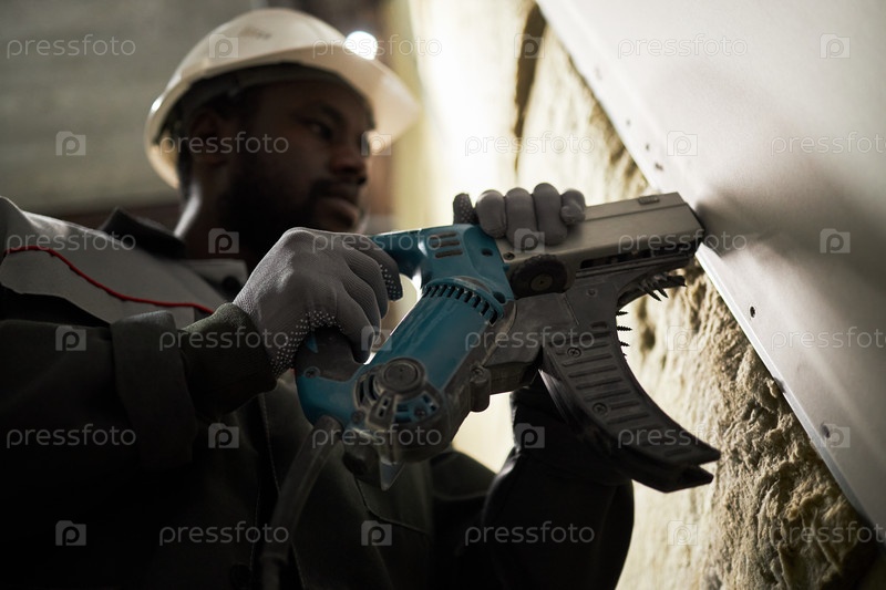 Африканский американец-строитель, использующий пистолет с гвоздями