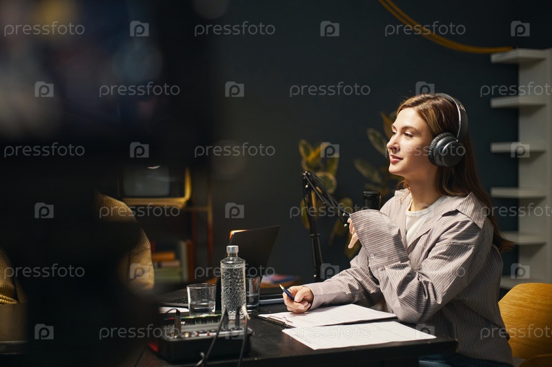 Женщина, разговаривающая с людьми во время онлайн-подкаста