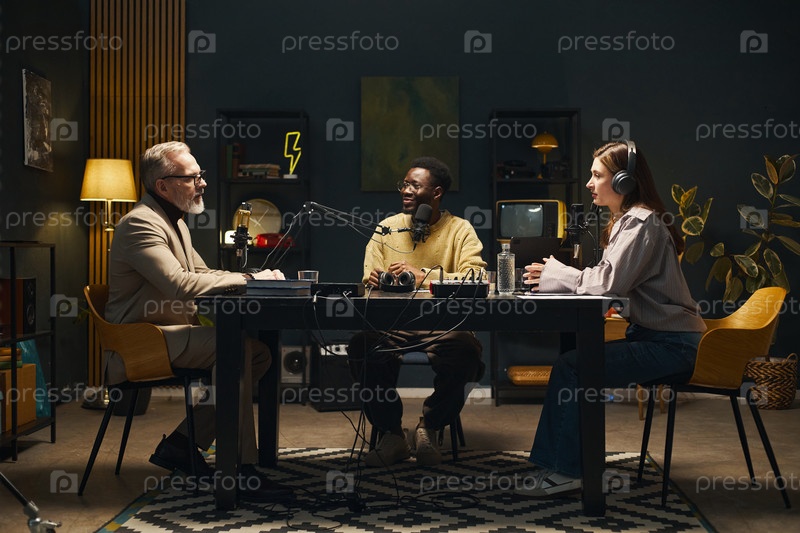 Молодые люди разговаривают с мужчиной во время подкаста