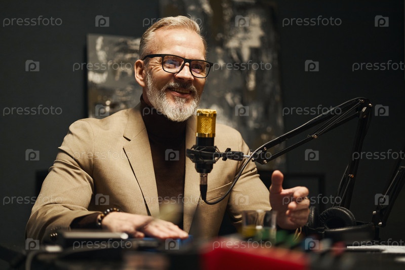 Зрелый мужчина имеет онлайн-подкаст в студии