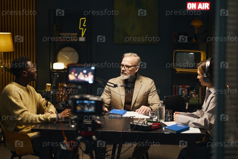 Люди, разговаривающие с писателем во время подкаста