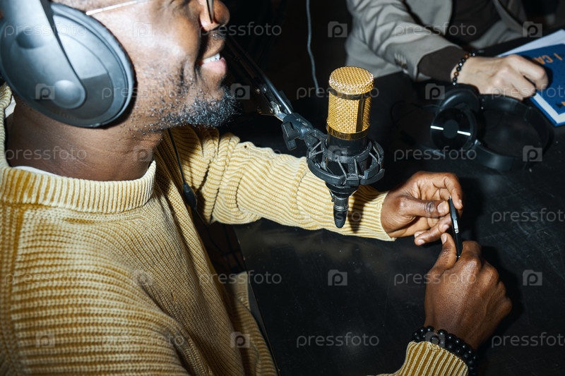 Человек, говорящий в микрофоне во время интервью