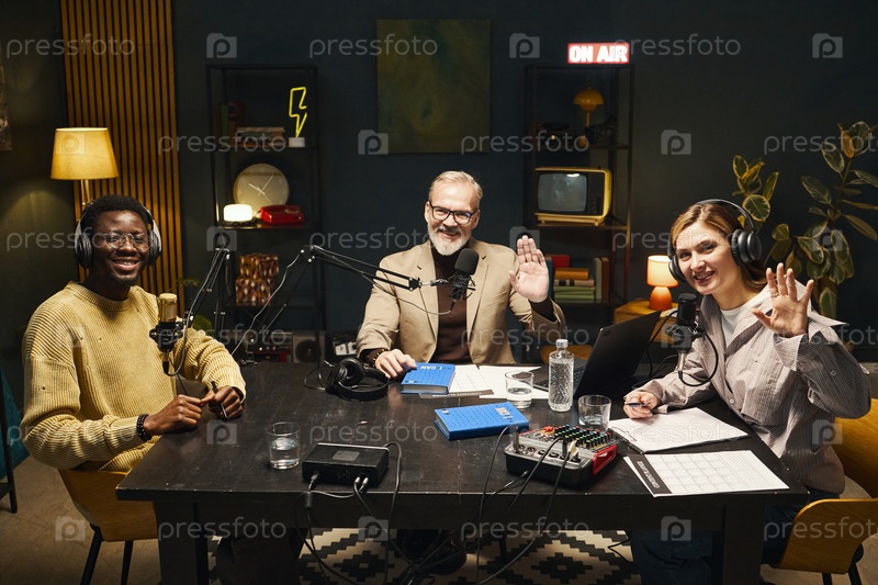 Люди обсуждают друг с другом во время подкаста