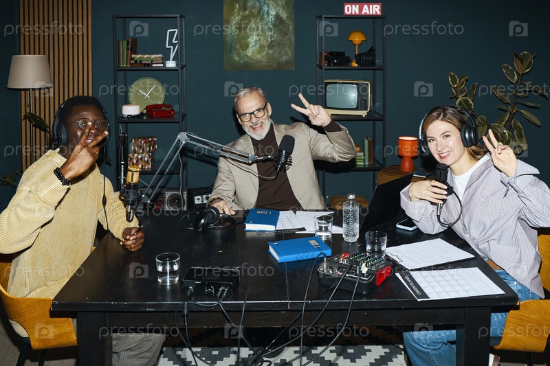 Люди, позирующие перед камерой во время подкаста