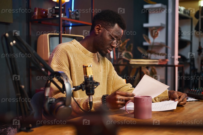 Журналист читает план контента перед подкастом