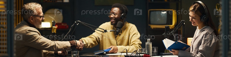 Молодые люди приветствуют мужчину во время интервью на радио