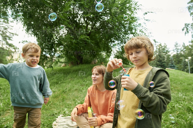 Милый мальчик, дующий пузыри в парке с семьей