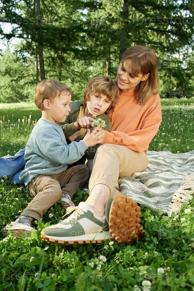 Счастливая мать с двумя мальчиками на одеяле в парке