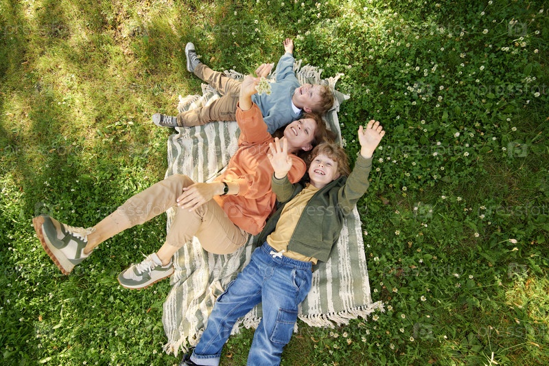 Веселая мать с двумя сыновьями на одеяле и махающей в камеру
