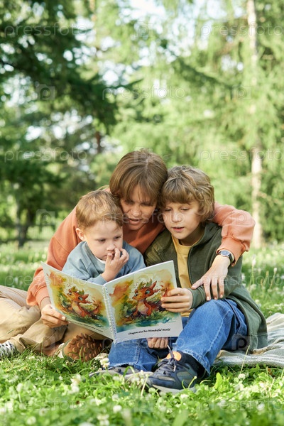 Мать обнимает двух мальчиков, читая книгу на одеяле в парке