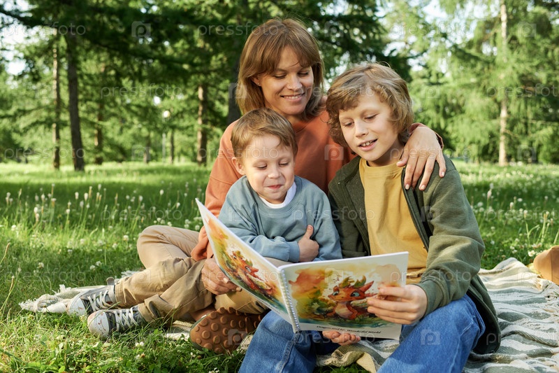 Мать и двое детей читают книгу на одеяле в парке