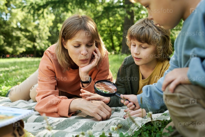 Счастливая семья в парке и использование лупы