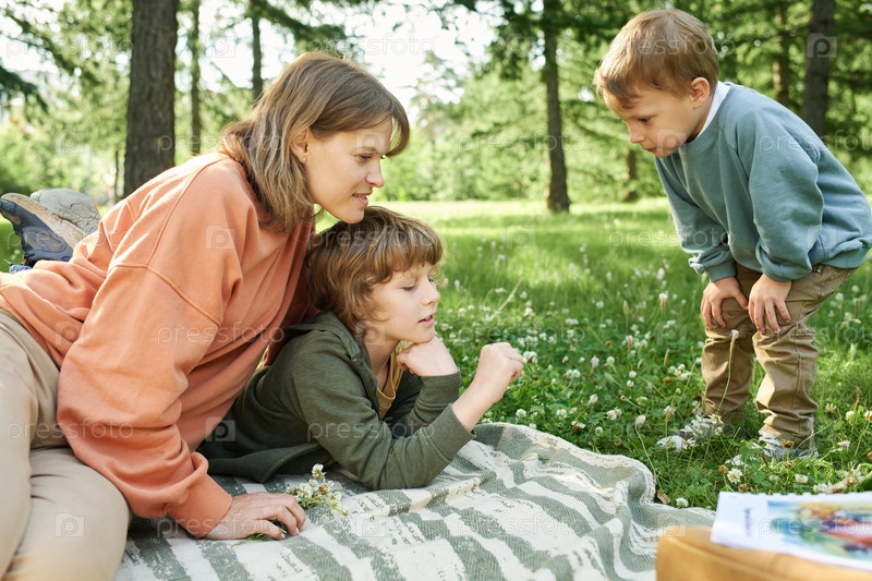 Мать с двумя мальчиками в парке смотрит на цветы клевера