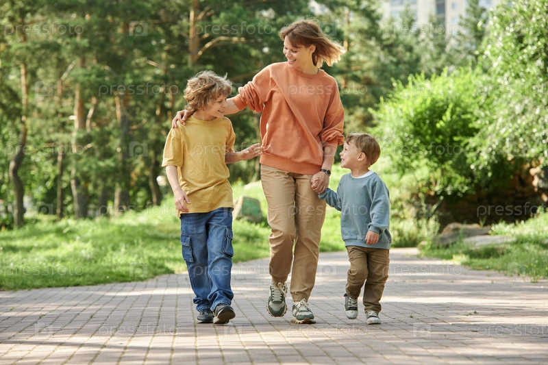 Счастливая мать с двумя мальчиками, которые держатся за руки и гуляют в парке