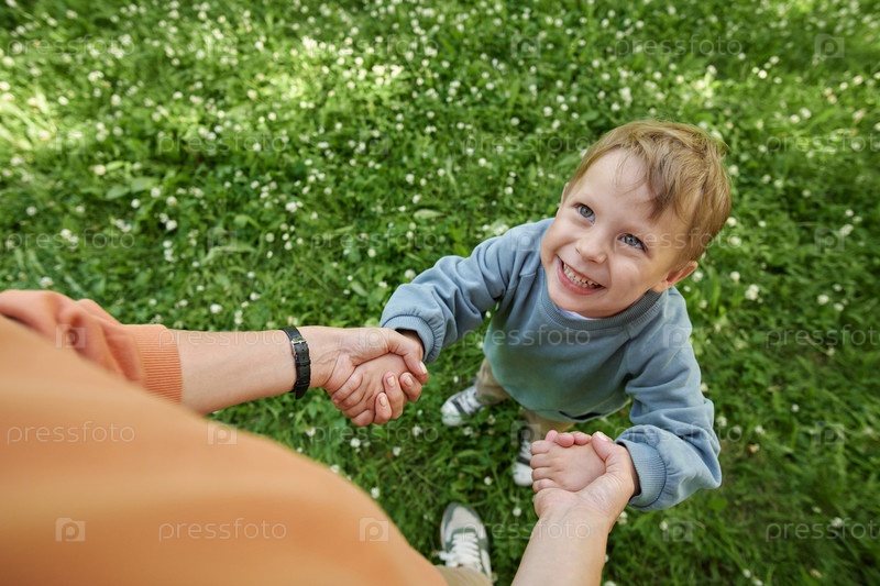 Улыбающийся мальчик смотрит на мать в парке