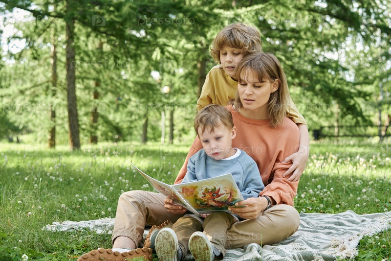 Мать с двумя мальчиками читает книгу на одеяле