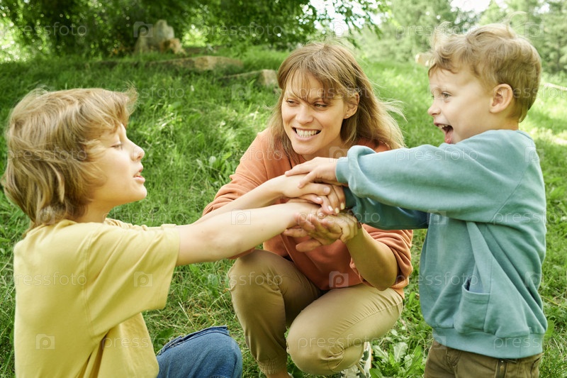 Улыбающаяся мать играет с двумя сыновьями в парке