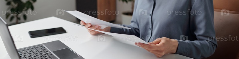 Женщина читает документы в Office Header Image