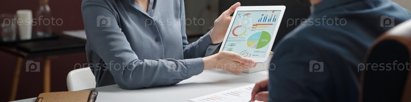 Улыбающаяся женщина указывает на планшет с таблицами данных Header Image