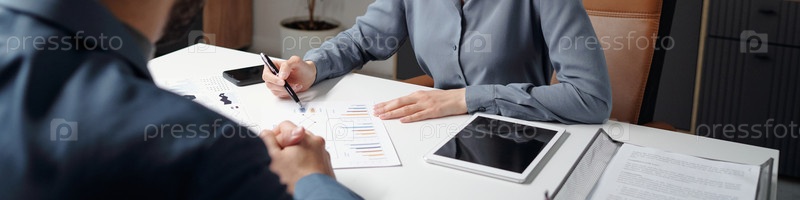 Улыбающаяся женщина указывает на отчет о данных во время встречи Header Image