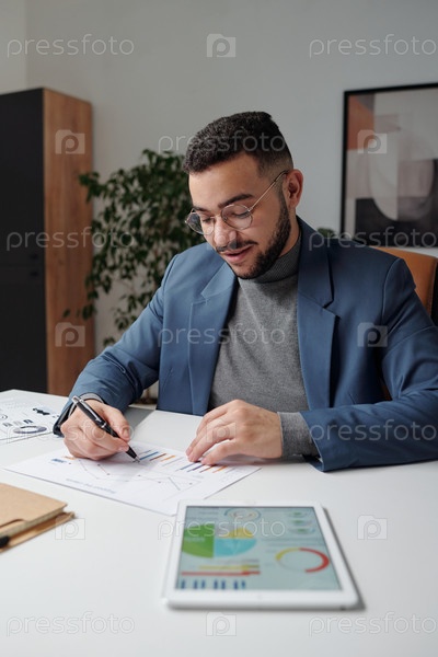 Человек анализирует документ со статистическими графиками