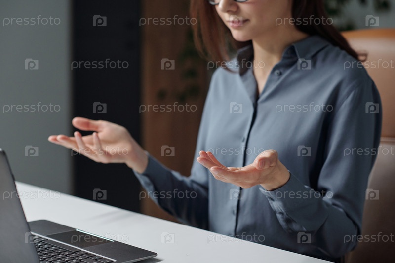 Элегантная женщина жестикулирует в онлайн-встрече