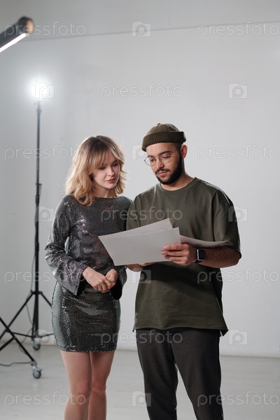 Молодая женщина консультирует помощника или режиссера за кулисами