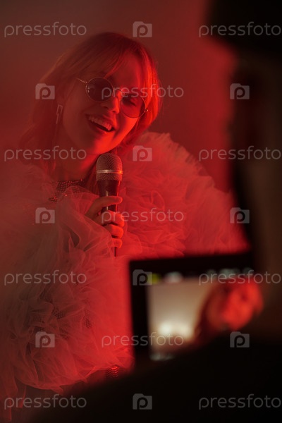 Улыбающаяся женщина держит микрофон и поет во время съемок видео