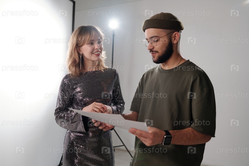 Режиссер разговаривает с юной улыбающейся женщиной за кулисами и держит записки