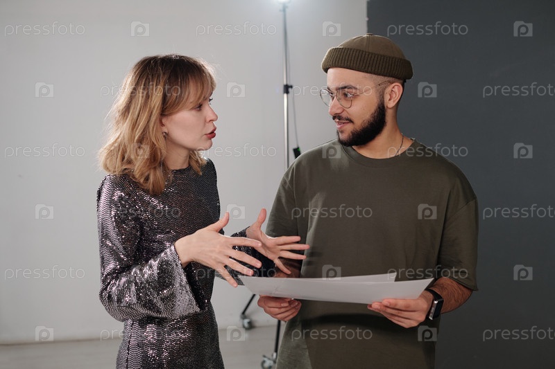 Режиссер разговаривает с юной улыбающейся женщиной за кулисами и держит записки